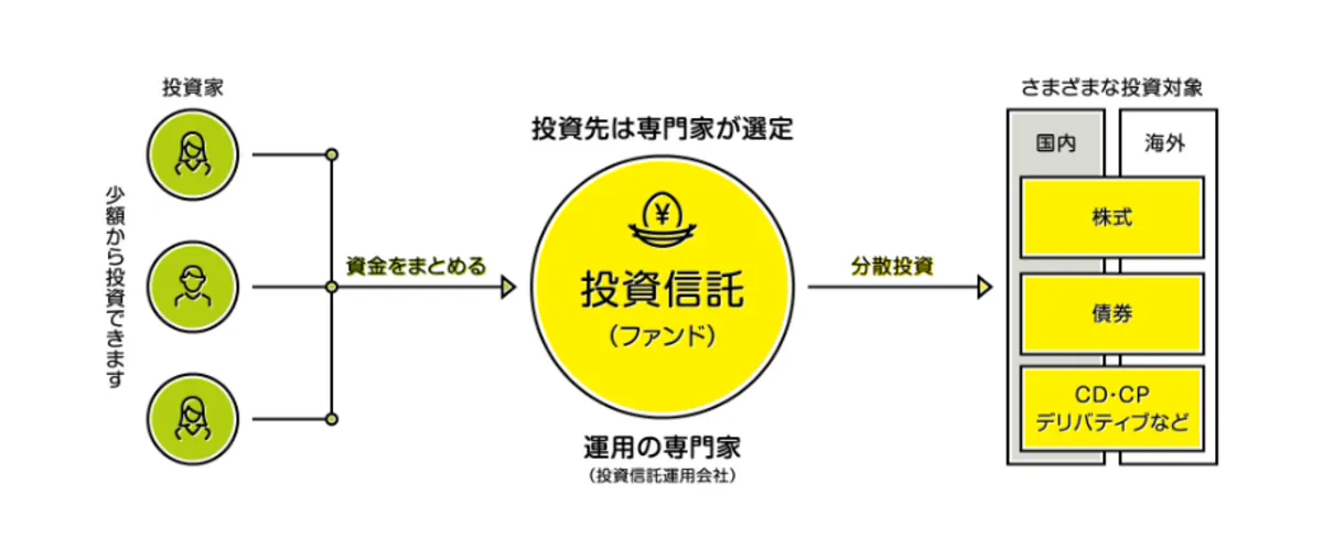 投資信託は、多くの投資家から集めたお金をひとつの大きな資金としてまとめ、運用のプロが株式や債券、海外資産などに分散して投資していく仕組みです。