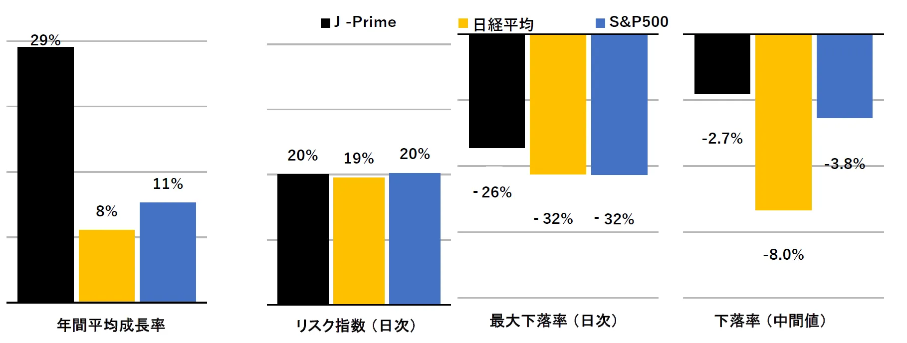 リスク指数 (日次) の比較では、J-Prime戦略は市場平均と同水準でありながら、最大下落率は日経平均やS&P500に比べて浅く、中央値ベースの下落率も小さく抑えられています。