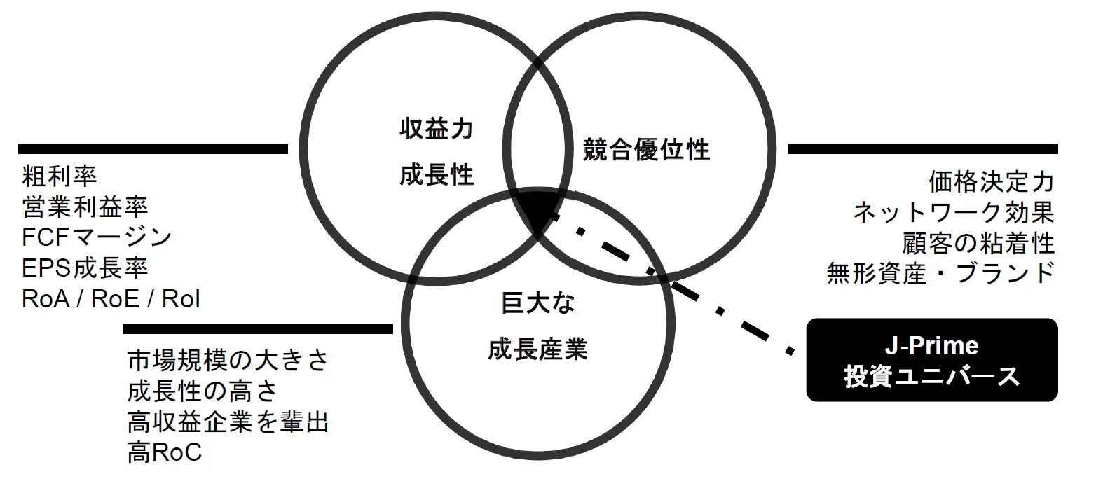 J-Prime戦略の投資対象は、日本を代表する上場企業の中でも、収益力・成長性・競合優位性の3つを兼ね備えた銘柄(=J-primeの投資ユニバース)に絞り込まれています。