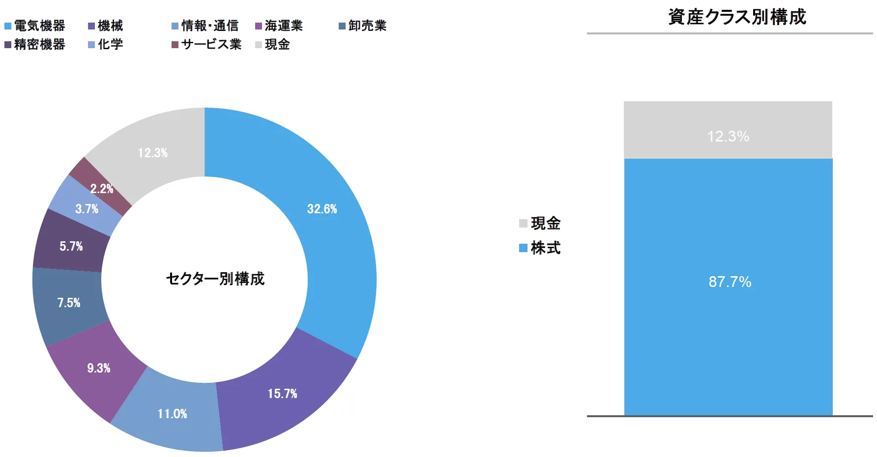 ポートフォリオ全体の大部分は株式で構成されますが、一部は現金・現金同等物(約10%前後)として保有し、流動性やリスクコントロールの余地を確保しています。