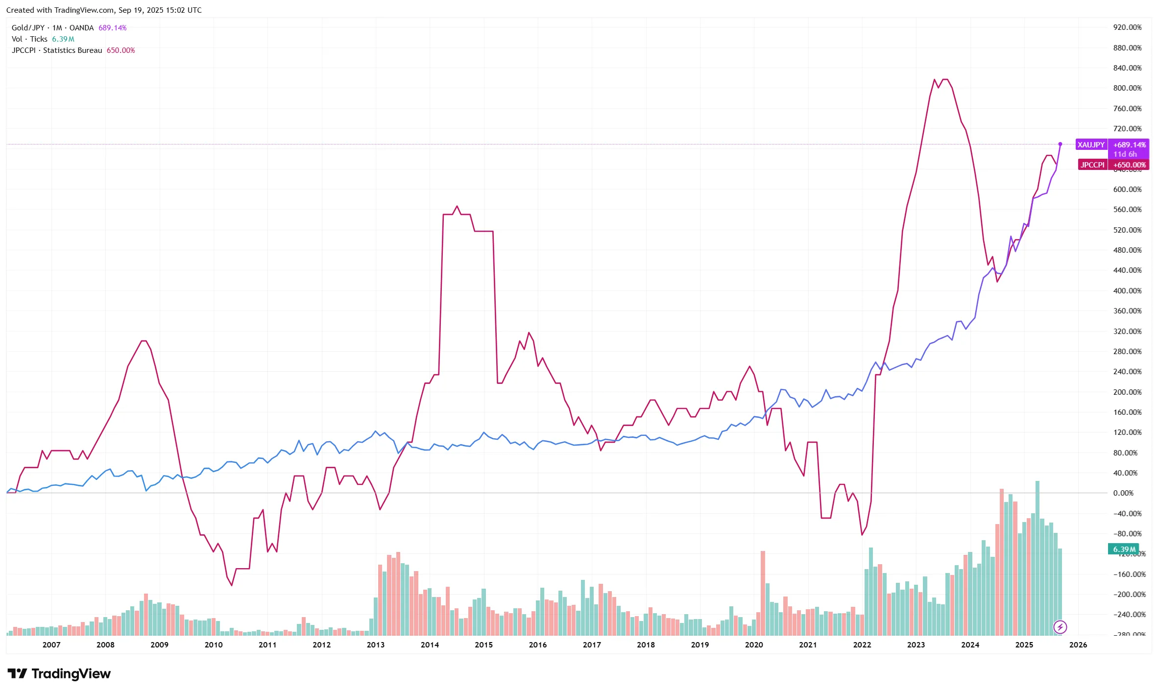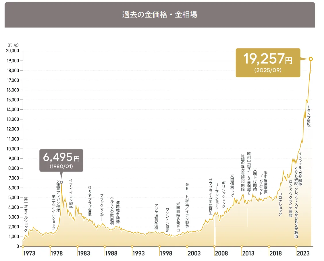 過去5年間、金価格は右肩上がりで推移し、2025年9月には1gあたり19,257円まで高騰しています。近年の高騰は米国銀行の破綻や地政学リスクを背景にした「有事の金」需要によるものです。
