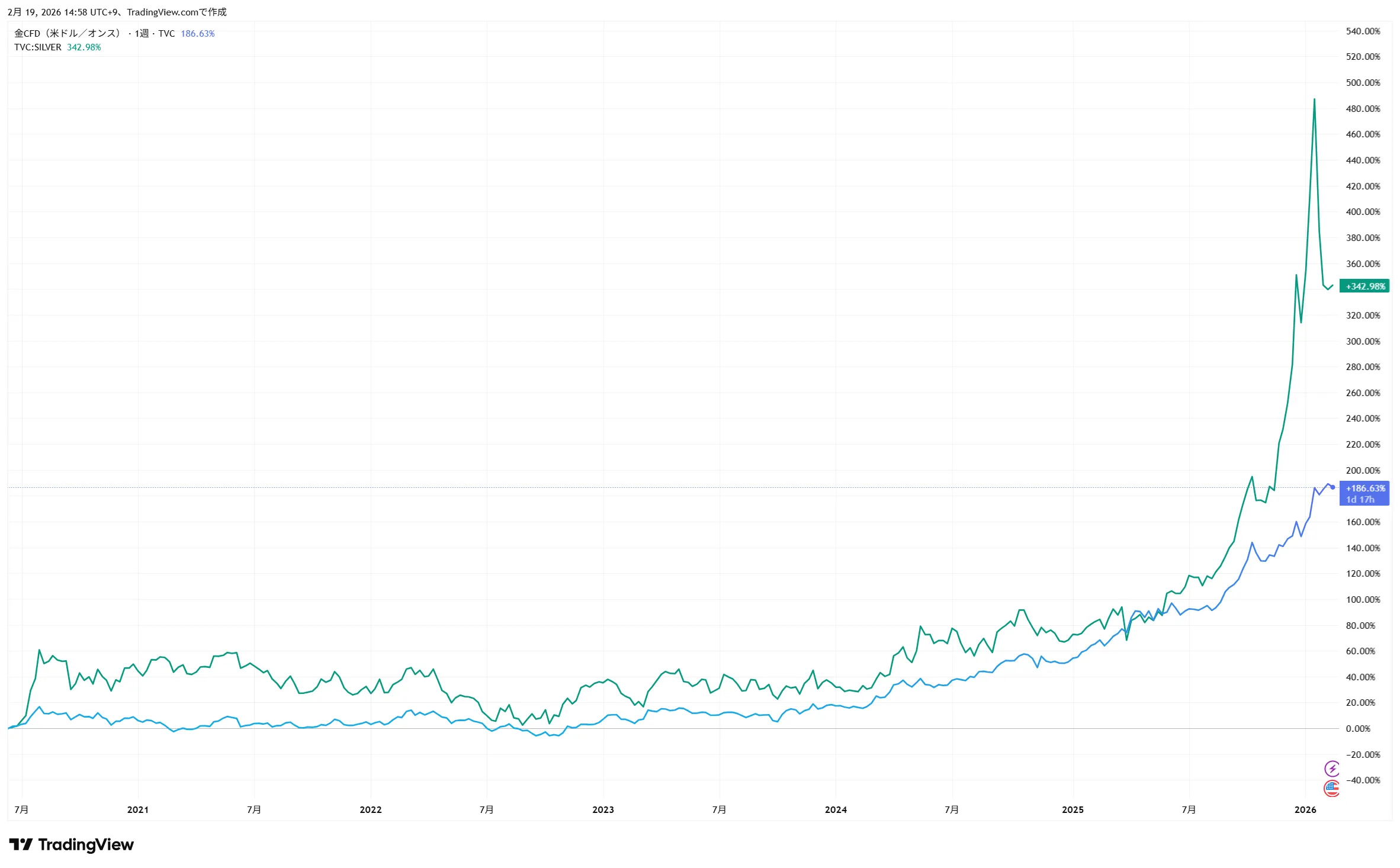 一方で、銀はドルや金利動向の影響を受けやすく、市場規模も比較的小さいため値動きの振れ幅が大きいという特長があります。実際に2026年1月末を境に銀価格は大きく下落し、足元でも調整局面が続いています。