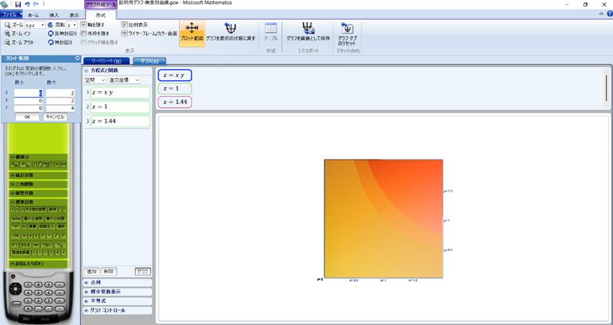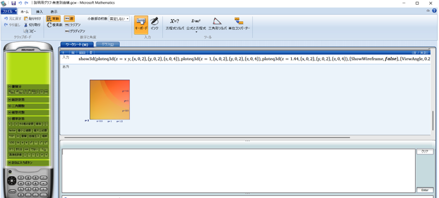 例えば図の様にグラフを描く欄を入力しています。これは実際に効用関数u(x,y)=xyを例に,「無差別曲線」という近代経済学の概念を,3次元の図を基に視点を変えて図示しています。
