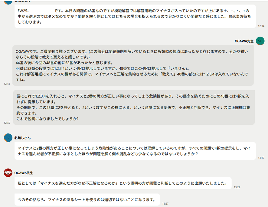 また,執筆者は普段,offchaと呼ばれるログイン不要で使えるスマホ向けチャットルームを質疑応答のための場所として各科目で提示して使っているのですが,最近或る方から「他の人に質問していることをとにかく知られたくないから」この方法では質問し難い,という声がありました(注:offchaは一応,名乗らないで質問もできます)。offchaのやり取りの例を(名前は伏せ)一部抜粋しておきます。